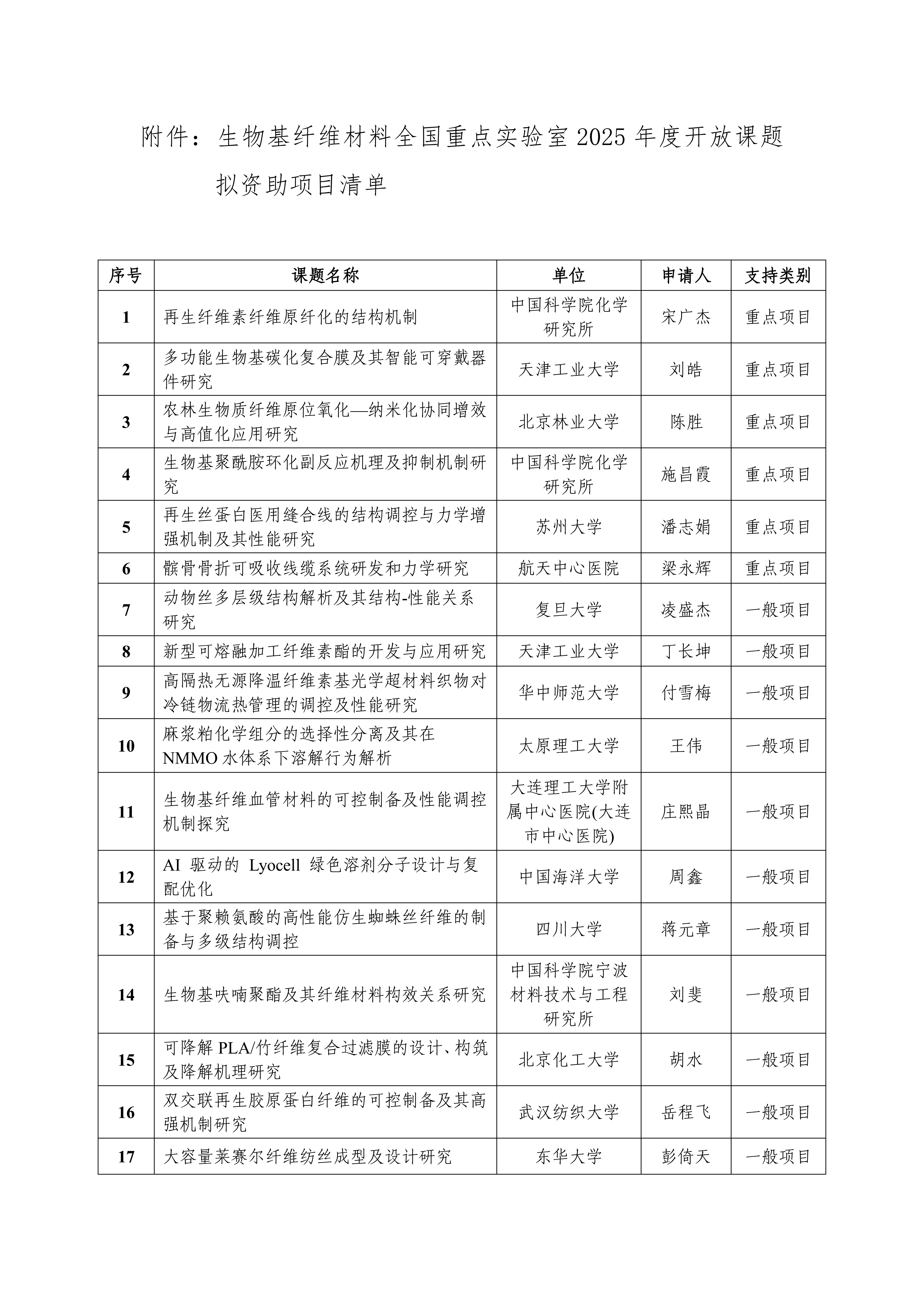 生物基纤维材料全国重点实验室2025年度开放课题拟资助项目公示